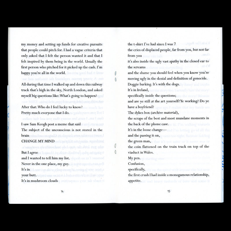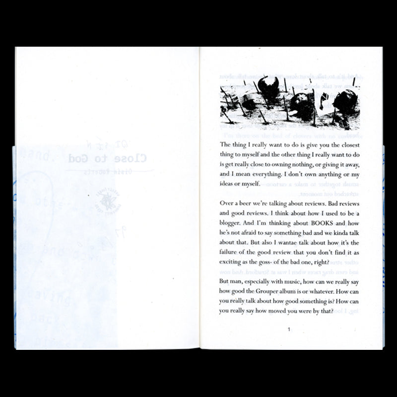 Close to God is the debut pamphlet by Oisín Roberts, combining pieces written for performance over the span of two years. In this pamphlet, Roberts reckons with the self in transition, speaking to his reader in an attempt to recover fragmented memories of childhood, relationships and discovery. Roberts finds transcendence in emptiness; he writes about feeling by getting you to feel something.